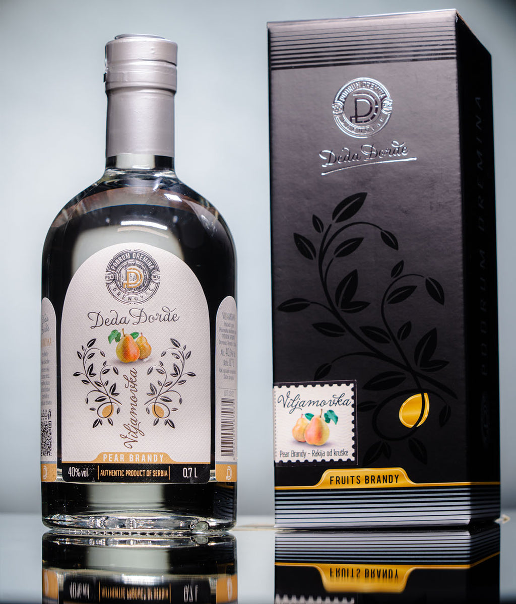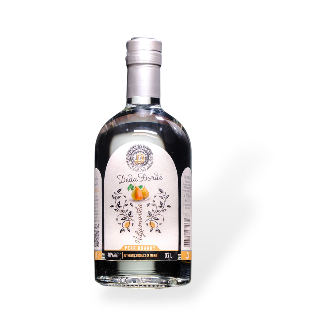 DEDA ĐORĐE Viljamovka ist ein hochwertiger Birnenbrand, hergestellt aus sorgfältig ausgewählten, vollreifen Früchten der Sorte Williams (Viljamovka). Durch traditionelle Destillation und einen streng kontrollierten Produktionsprozess entsteht ein edler Obstbrand mit ausgeprägter Aromatik, kristallklarer Reinheit und elegant ausgewogenem Geschmack.